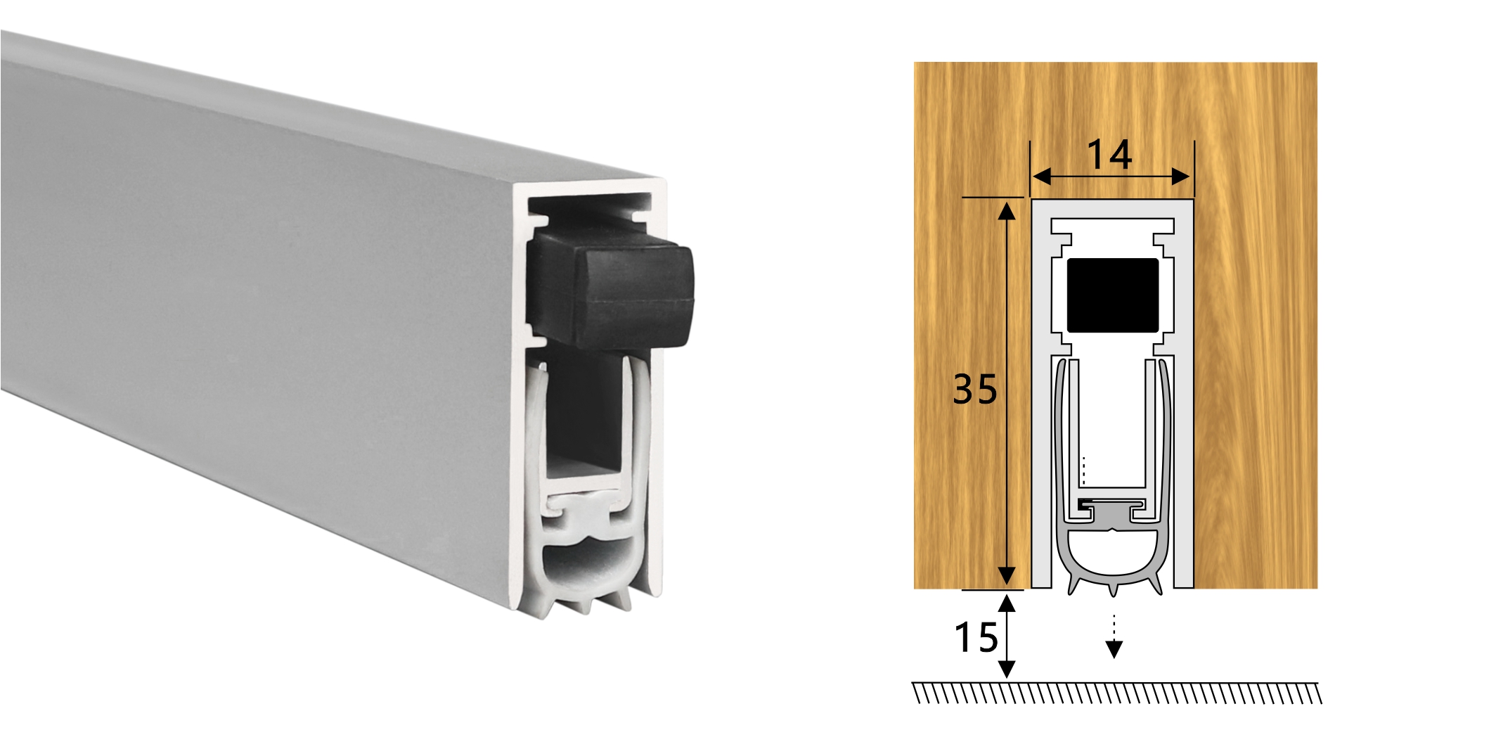 嵌入式門底自動升降式密封器,四連桿機(jī)構(gòu),適用于門扇內(nèi)開槽的門。安裝時(shí)需在門底加工一條35mm*14mm的通槽,將產(chǎn)品放置其中,將兩端蓋板和密封器用螺絲固定,使用本產(chǎn)品不影響門的整體風(fēng)格。