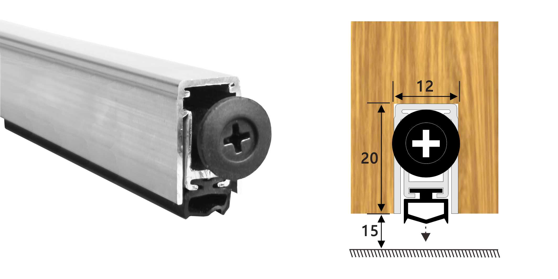 嵌入式門底自動升降式密封器,四連桿機構,適用于門扇內開槽的門。安裝時需在門底有一個20mm*12mm的通槽,將產品放置其中,將兩端蓋板和密封器用螺絲固定(或用螺絲從密封條底部向上固定),使用本產品不影響門的整體風格。