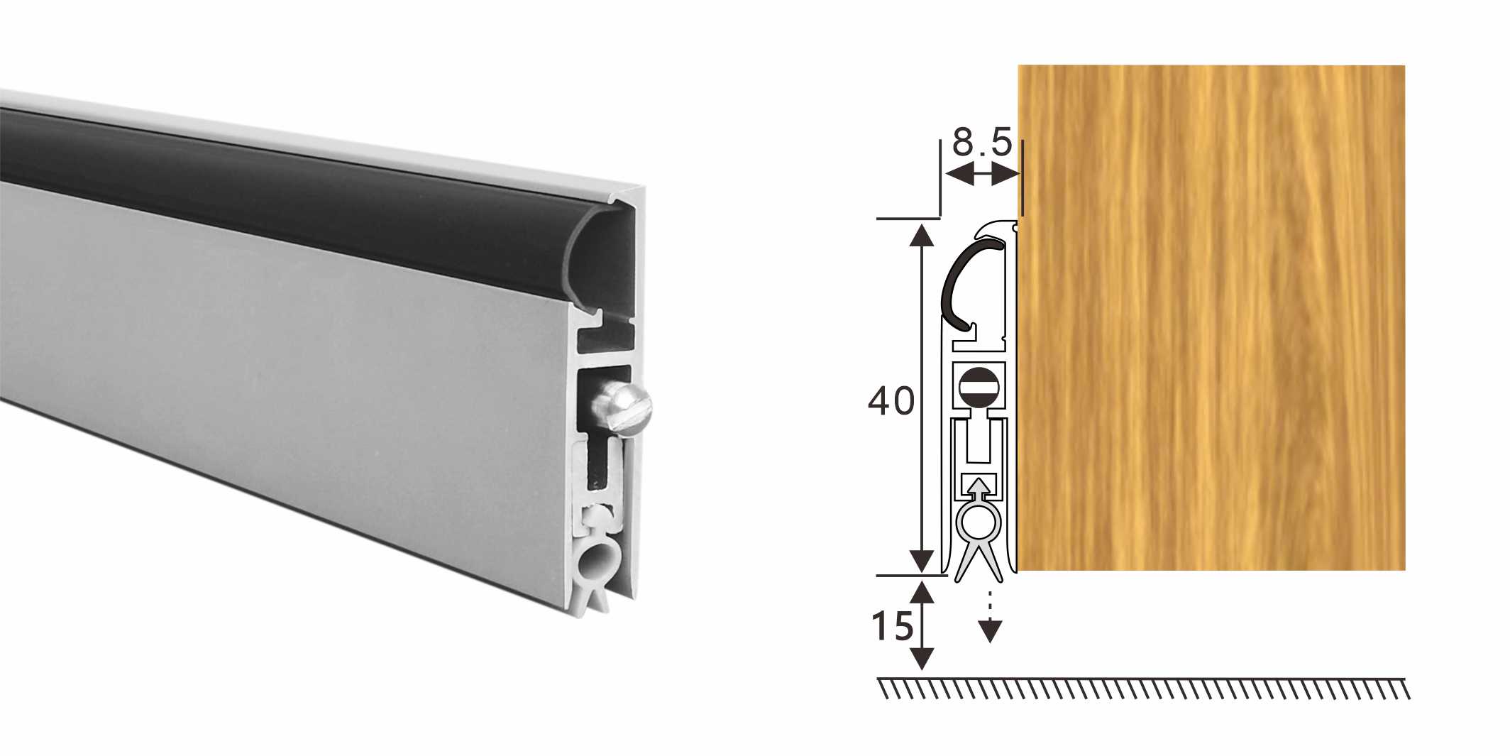 外裝式門底自動(dòng)升降式密封器,安裝在門底表面,適用于后補(bǔ)工程,如已安裝到位的門需要增加隔音,隔溫,防