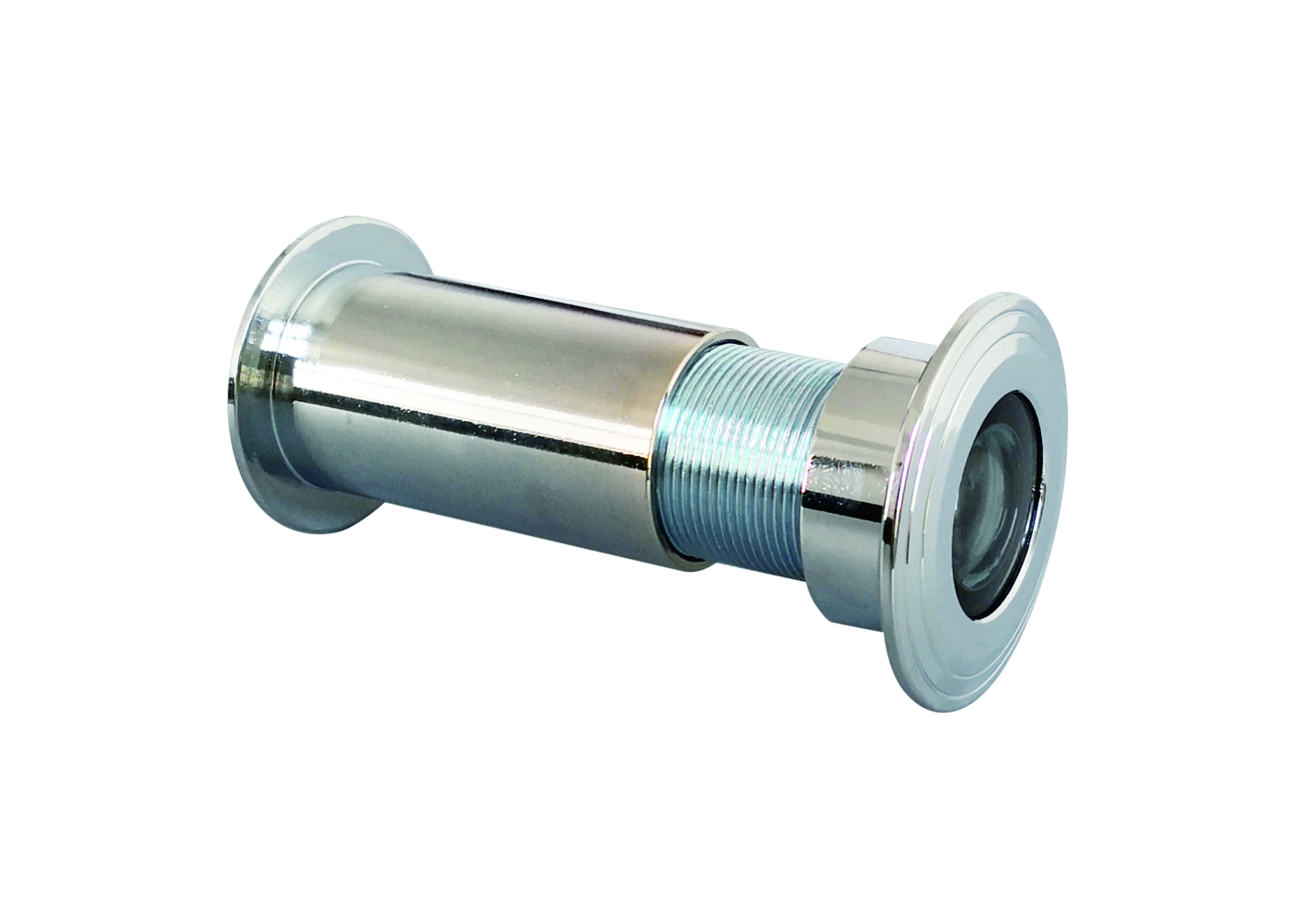 防火門鏡是通過裝在門鏡芯套內的高膨脹材料在火 災溫度(≥180℃)下迅速膨脹發泡,在極短的時間內 ( 一般≤8 min), 將防火門窺視孔封堵, 起到阻止火 勢蔓延、煙氣、毒氣外溢的作用。本產品設計新穎、結構合理、光學鏡片組,視角廣闊、造型美觀大方。門鏡 所用金屬配件鍍鉻,具有防腐蝕、防氧化、性能穩定、 使用壽命長、安裝簡便等。